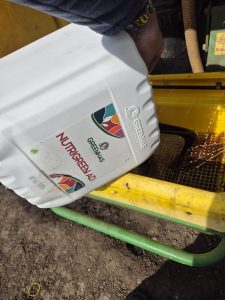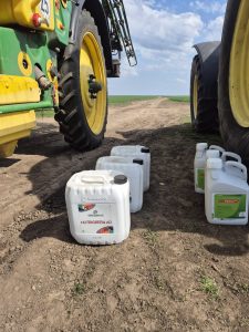 ​Un avantaj major pentru logistica fermei este faptul că Nutrigreen AD este perfect compatibil cu orice fungicid și erbicid. Ca atare, fertilizantul a fost aplicat astăzi împreună cu fungicidul, permițând o intervenție rapidă și eficientă. Această compatibilitate totală permite economisirea timpului și a combustibilului, fără a compromite sub nicio formă eficacitatea tratamentului fitosanitar (în acest caz, Falcon Pro, vizibil în pregătirea soluției).